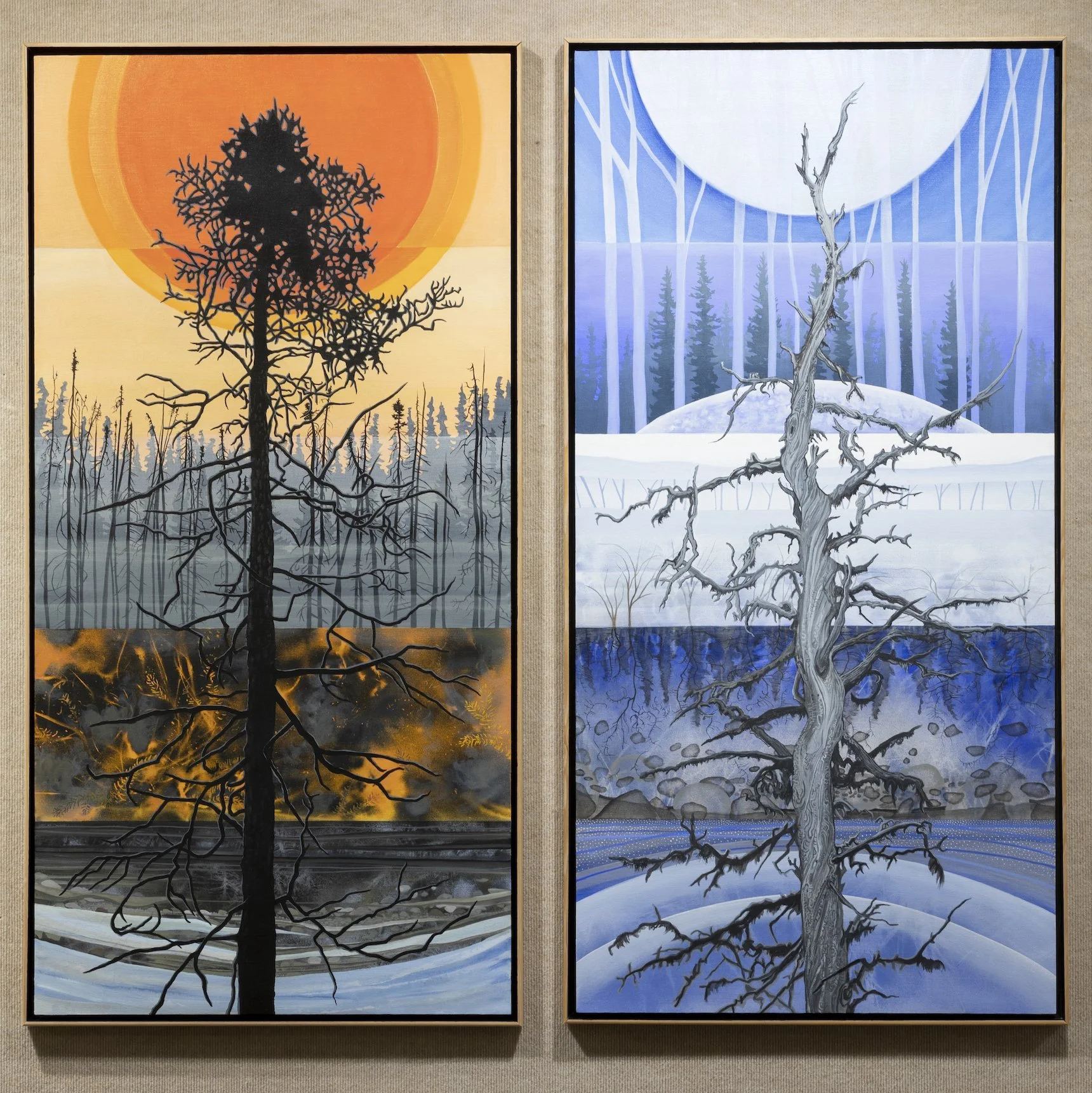 They stand with the living, refuse to lie down. One rises from snow and ice, her elegant bones bare. A century has passed since she surrendered to wildfire that flashed through the valley. The other prevails after a recent firestorm. Branches remain despite the heat and sparks, the violence and pressure that took her. She lingers amidst threads of summer smoke.