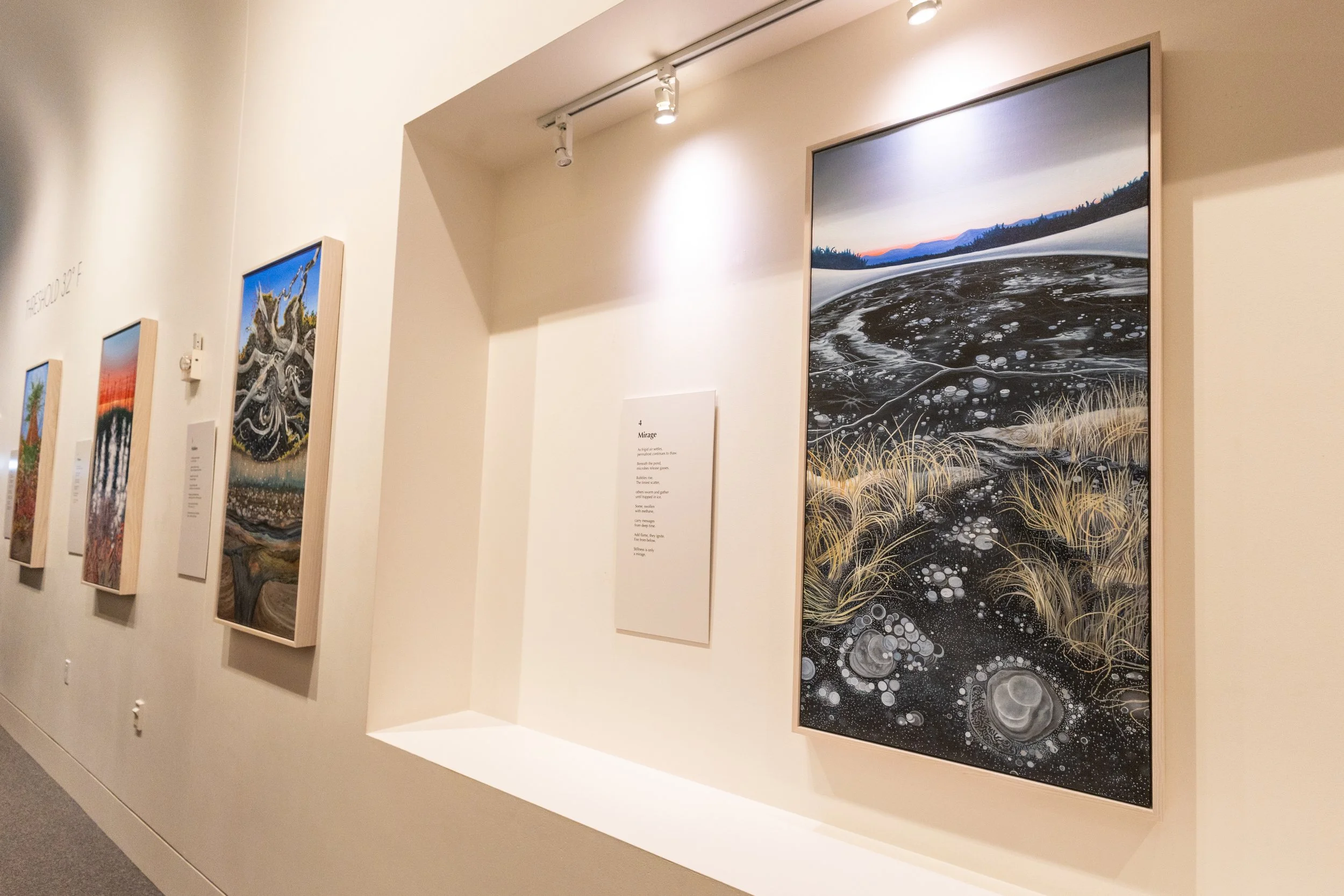 Threshold 32°F, by artist Klara Maisch, writer Debbie Clarke Moderow, and ecologist Rebecca Hewitt, is a multidisciplinary narrative about change in the boreal forest. Together, the voices of Maisch, Moderow, and Hewitt take the audience on a journey that unfolds in a sequence of ten paintings, poems, and scientific field notes.